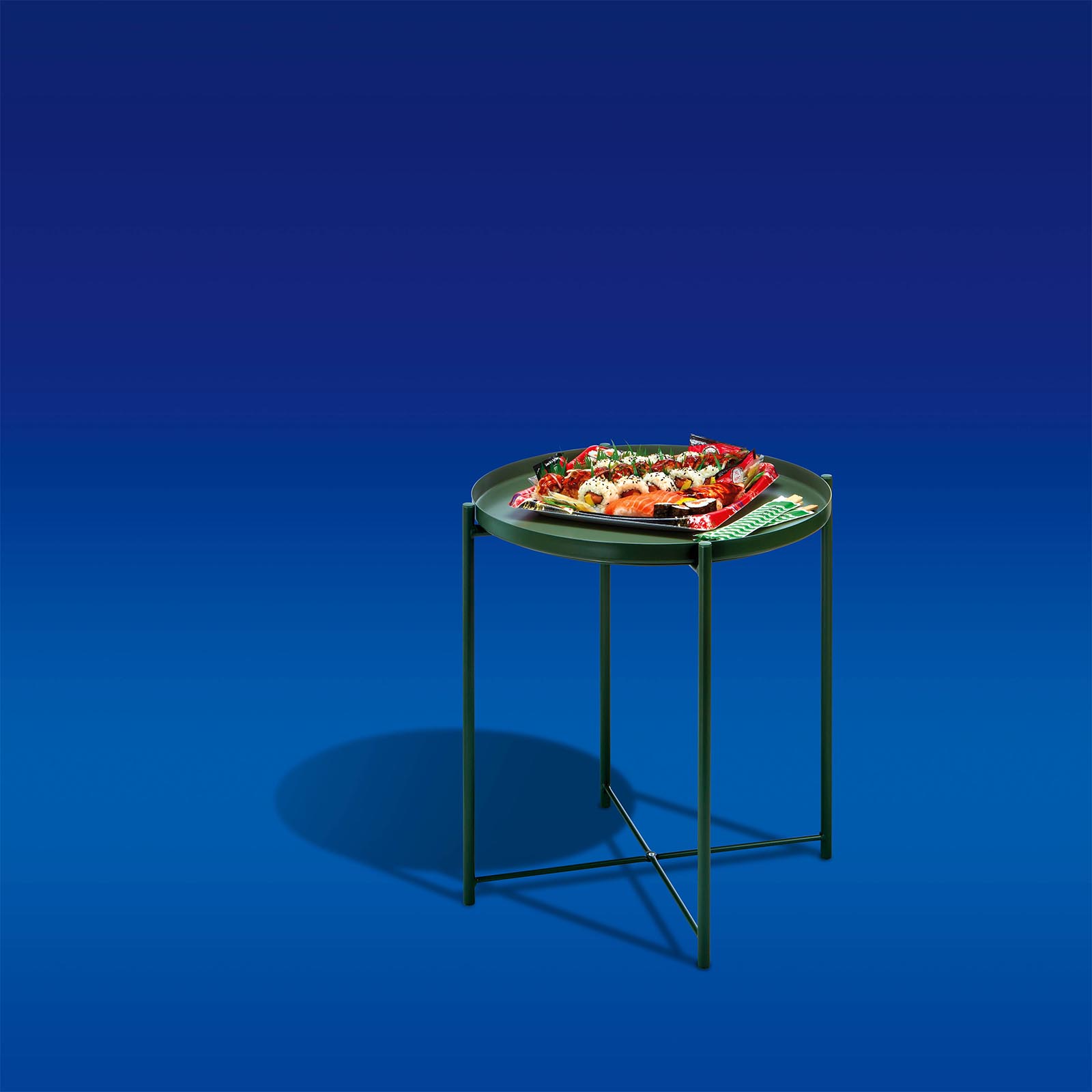 IKEA were announcing their amazing $9 delivery fee. The kind of fee you expect to pay (back then) for a takeaway food delivery. The visual idea was to shoot various IKEA pieces with takeaway food on them. And we needed really simple, strong images that would cut through in OOH. Hence the bright blue and yellow backgrounds, matching IKEA's Swedish branding.